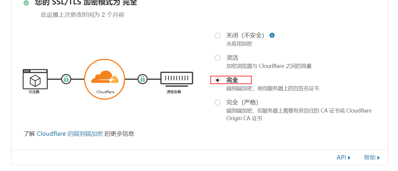 如下图,源服务器开启SSL后别忘了在Cloudflare后台将 SSL/TLS 加密模式改为完全或严格